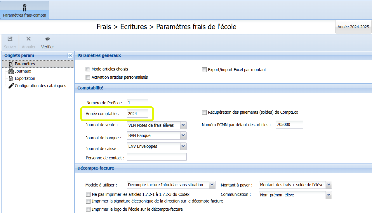 Avant de procéder à un export vers ComptEco, il faut veiller à paramétrer l’année comptable dans les paramètres frais-compta. Ce sont les élèves, les factures et les paiements de l’année comptable paramétrée qui seront exportés de ProEco5. Pour procéder à l’export des factures et paiements d’une autre année comptable, il faut dès lors la modifier dans les paramètres frais-compta.