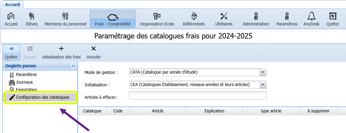 Le logiciel vous positionne sur les paramètres frais-compta afin que vous les passiez en revue. Si le paramétrage est bon, vous vous positionnez sur l’onglet <Configuration des catalogues> :