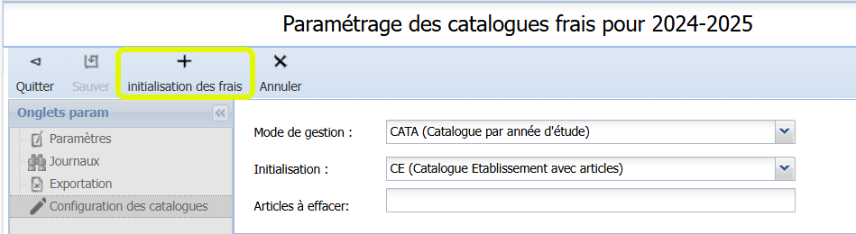 Après avoir choisi le mode de gestion des catalogues, vous pouvez lancer l'initialisation des frais. Pour ce faire, vous appuyez sur le bouton <Initialisation des frais> :