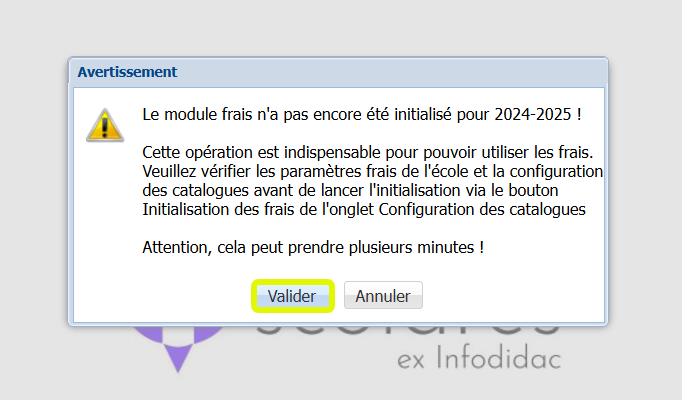 Lorsque votre paramétrage des frais et des catalogues est terminé, vous pouvez passer à l’initialisation des frais. Attention ! L’initialisation des frais va figer votre paramétrage des catalogues. Il est encore temps de vérifier que les paramètres des catalogues sélectionnés sont bien ceux que vous souhaitez activer pour toute l'année scolaire.