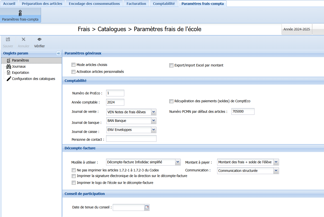 Les paramètres frais de l’année scolaire précédente ont été copiés pour la nouvelle année scolaire. Il est important de vérifier si ceux-ci sont toujours d’actualité pour la nouvelle année scolaire :