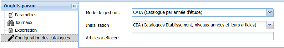 Si nécessaire, il est encore possible de modifier le paramétrage des catalogues. En revanche, il ne sera plus possible de le modifier après l’initialisation des frais : après l’initialisation, le mode de gestion et la copie des catalogues/articles sont définitifs pour la nouvelle année scolaire.