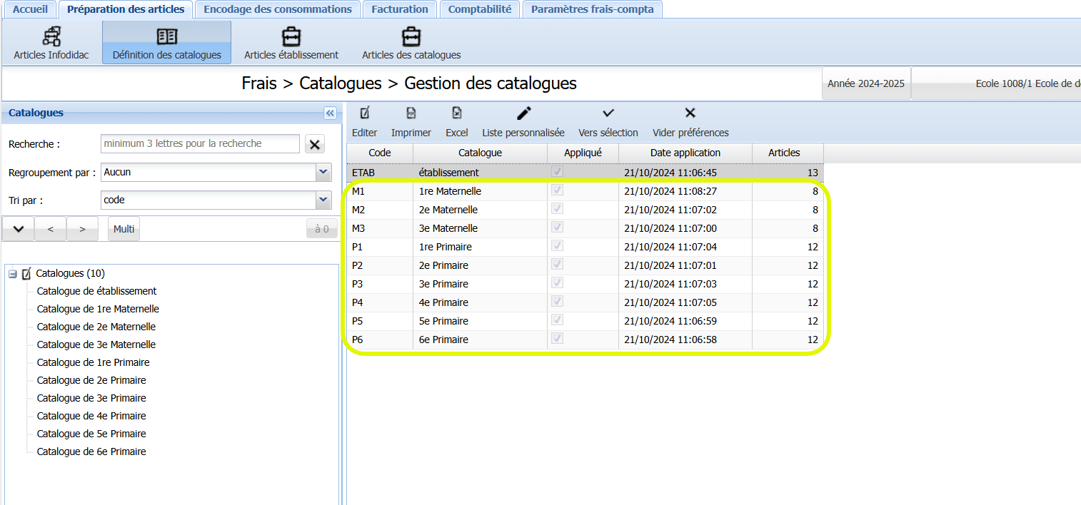 Même si la P1 A se trouve dans l’implantation 1 et la P1 B dans l’implantation 2, les élèves de P1 A et de P1 B partagent le même catalogue de P1. Il y a donc un catalogue d’articles scolaires par année d’étude :