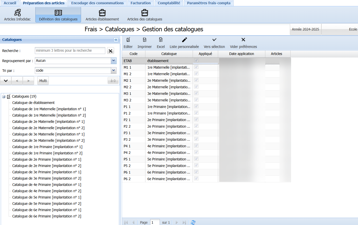 Dans la gestion générale des catalogues d’articles, qui est activée par défaut dans ProEco5, chaque année d’étude possède son propre catalogue, toutes implantations confondues.