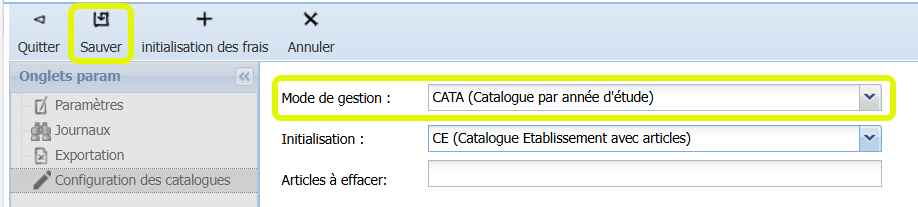 Le mode "CATA (Catalogue par année d’étude)" est le mode de gestion « classique ». Vous pouvez opter pour "CATI (Catalogue par implantation)" si vous le souhaitez. Il faut ensuite appuyer sur le bouton <Sauver> avant de lancer l’initialisation des frais.