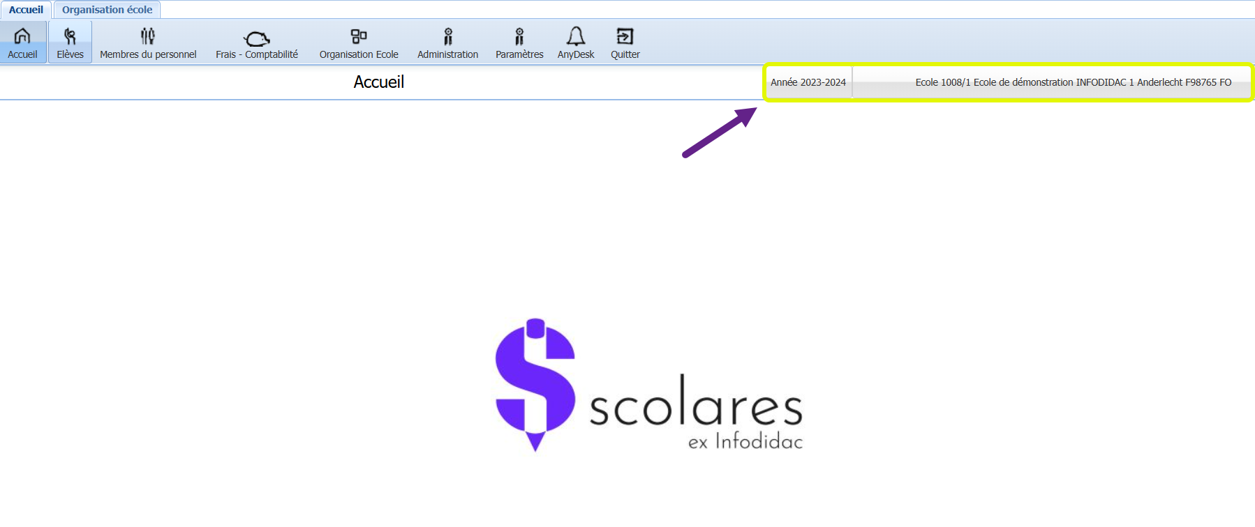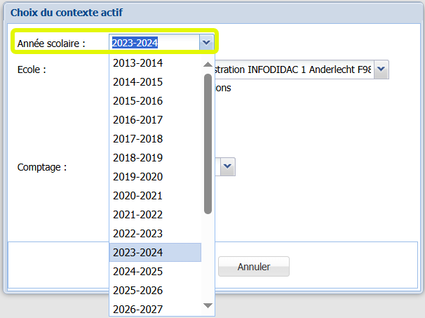 Dans la liste déroulante du champ <Année scolaire>, vous sélectionnez celle qui correspond à la prochaine année scolaire. Ensuite, vous sauvegardez. Votre ProEco5 est maintenant positionné sur l’année suivante.