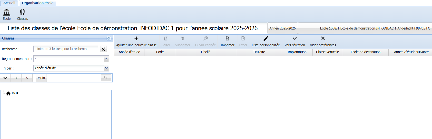 Dans le menu principal, vous appuyez sur le bouton <Organisation école>. Le module qui s’ouvre est le module Classes.
