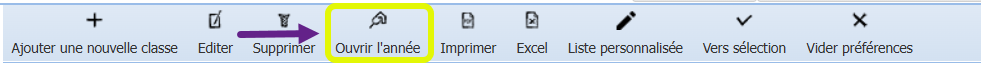 Dans le menu d’actions du module Classes, le bouton <Ouvrir l’année> est actif.
