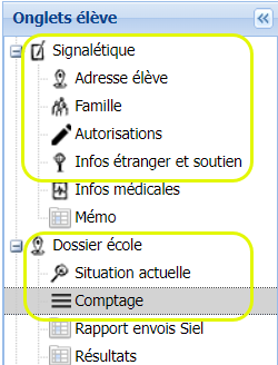 Avant d’envoyer les inscriptions des élèves dans SIEL, il est important de vérifier les données encodées dans leurs fiches. Pour ce faire, vous pouvez vous référer à la page du mode d’emploi À vérifier avant les envois dans SIEL. Les fiches à vérifier sont les fiches Signalétique, Adresse élève, Famille, Informations étranger, Dossier école, Situation actuelle et Comptage :