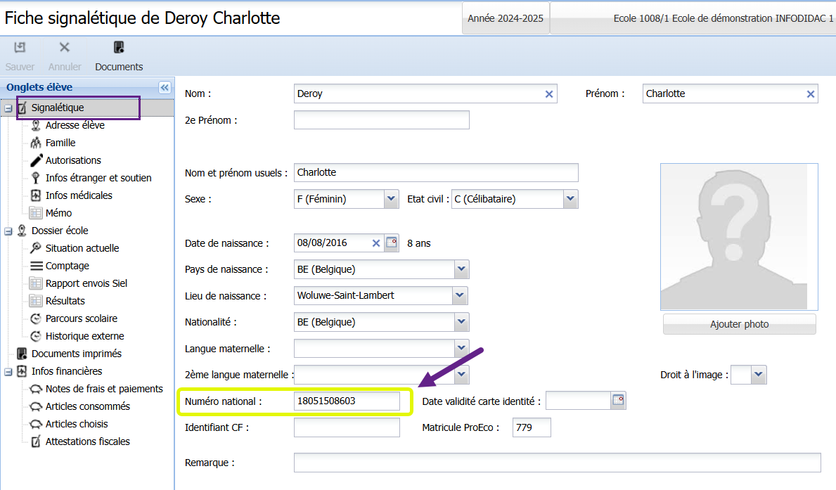 Le numéro de registre national des élèves belges doit impérativement être complété sous l’onglet Signalétique :