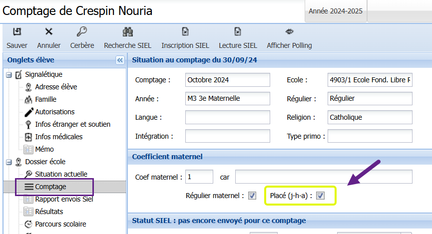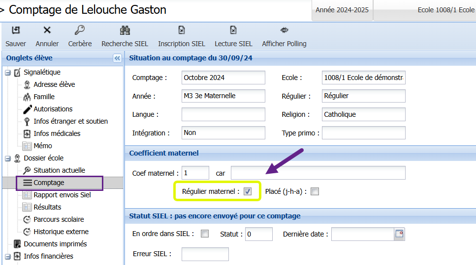C’est sous l’onglet Comptage qu’il faut spécifier si un élève est régulier ou non en maternelles :