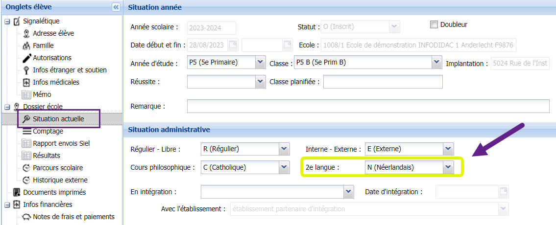 Il ne faut pas oublier d’encoder la seconde langue chez les élèves de primaire qui suivent le cours de langue moderne : elle est obligatoire de P3 à P6. La seconde langue s’encode sous l’onglet Situation actuelle :