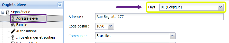 Dans l’adresse de l’élève, le pays peut facilement vous échapper lors de l’encodage :