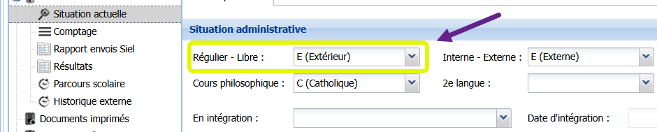 Si vous avez un accord avec une école spécialisée pour organiser une ou plusieurs classes inclusives, il faut savoir que ces élèves ne doivent pas être envoyés dans le comptage de l’ordinaire. Dans ProEco5, il faut indiquer que ces élèves sont "Extérieurs" dans leur Situation actuelle :