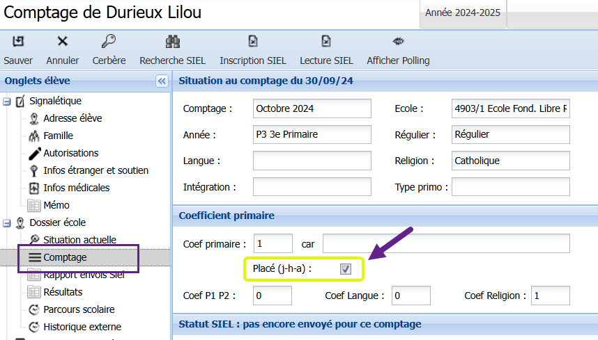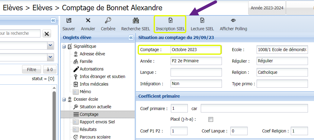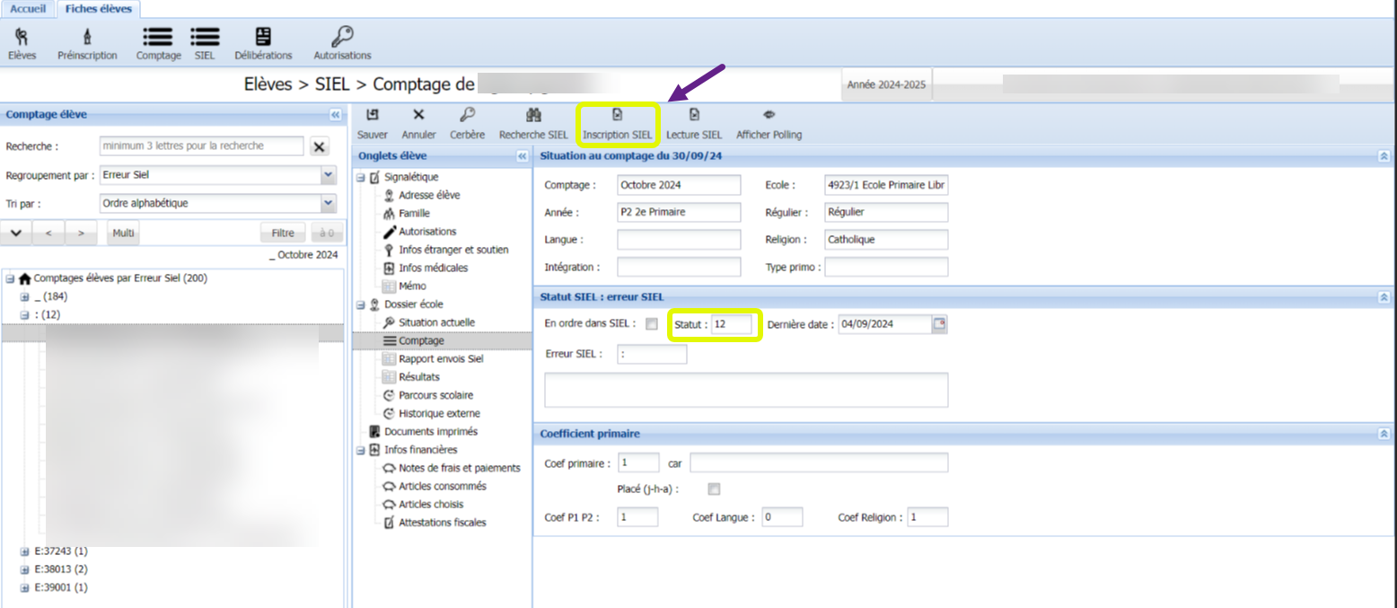 Vous vérifiez d’abord que le comptage est bien celui d’octobre 2024. Ensuite, vous appuyez sur le bouton "Inscription SIEL" dans le menu d’actions. L’inscription de l’élève sélectionné est envoyée dans SIEL.