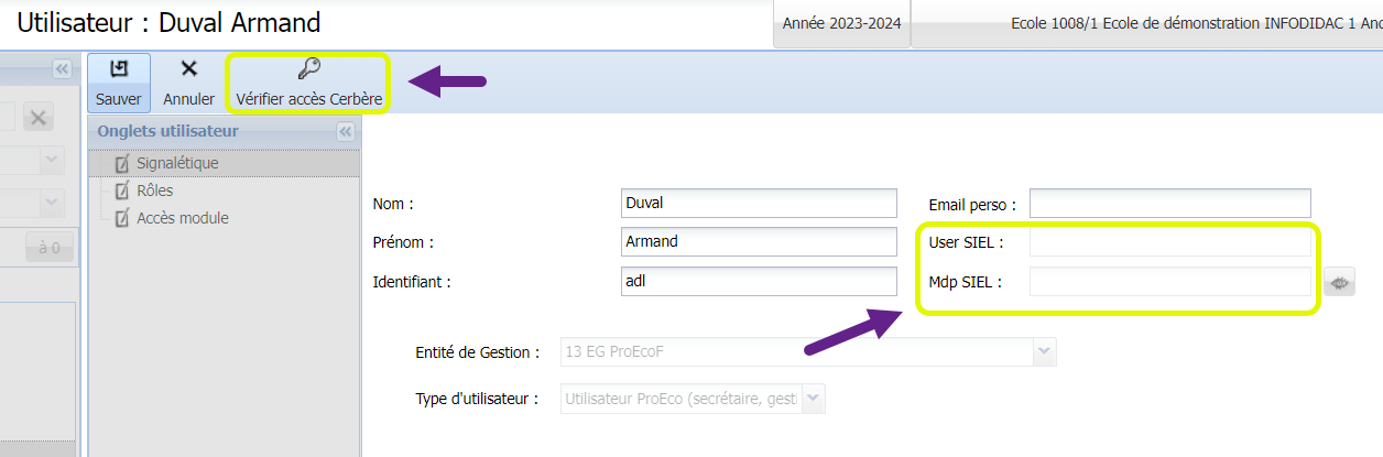 Pour pouvoir procéder à des envois SIEL, il faut que vos accès Cerbère aient été encodés dans votre fiche d’utilisateur de ProEco5. Celle-ci se trouve dans l’application Administration.