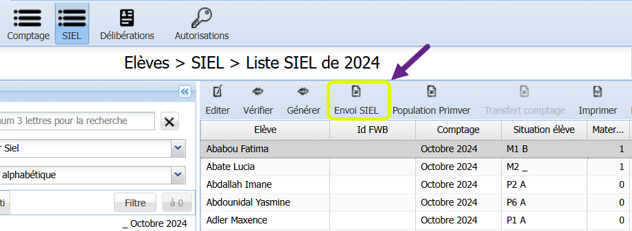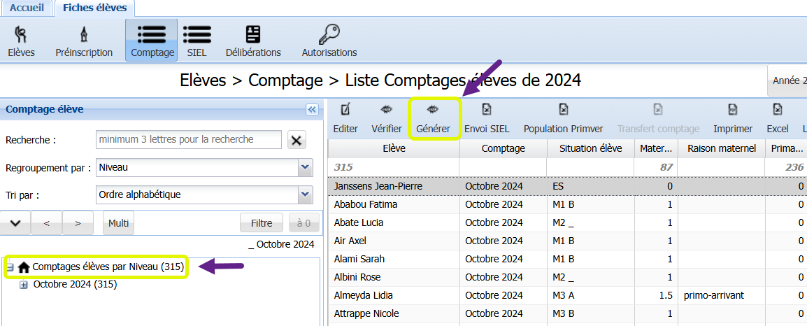 Avant d’envoyer toutes les inscriptions des élèves dans SIEL, il faut générer leurs lignes de comptage.