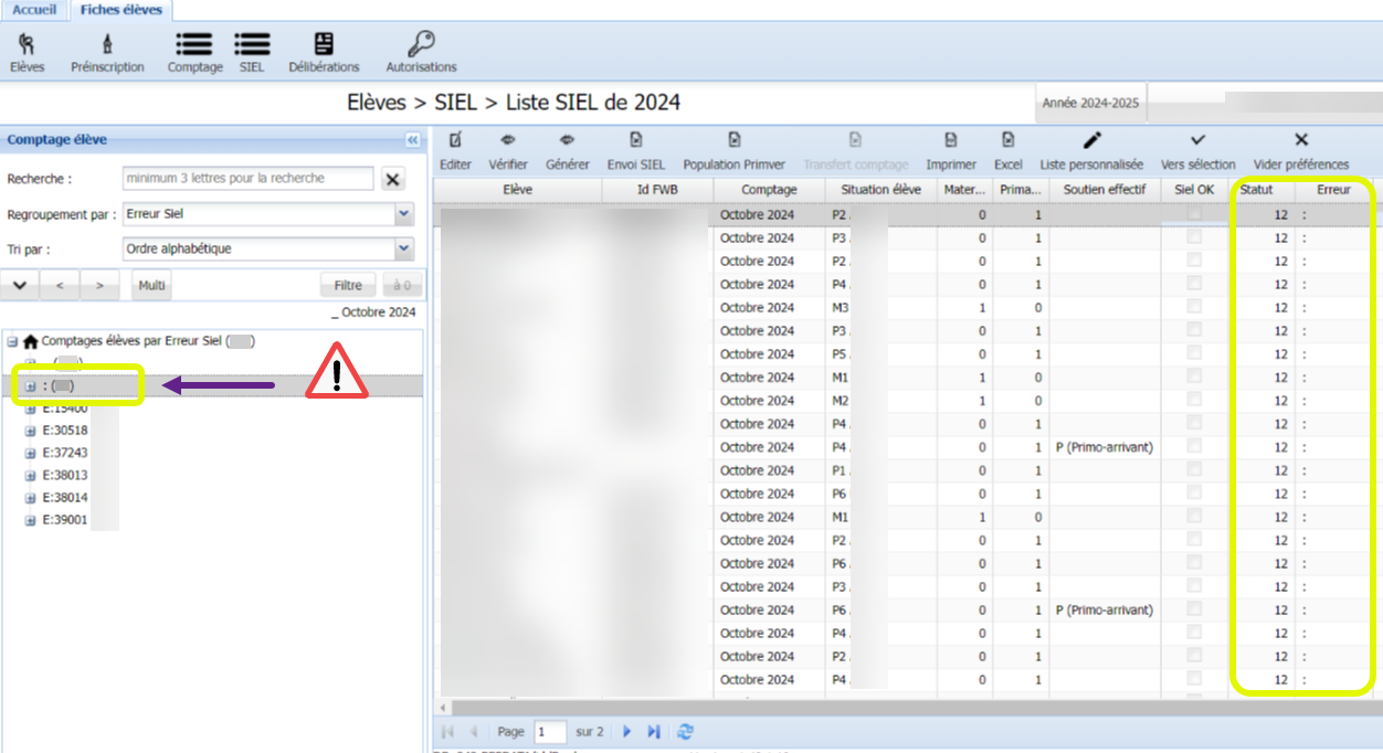Si vous avez des inscriptions au statut « 12 », cela signifie que son envoi a échoué. Dans ce cas, il faut les renvoyer une à une manuellement via le bouton "Inscription SIEL".