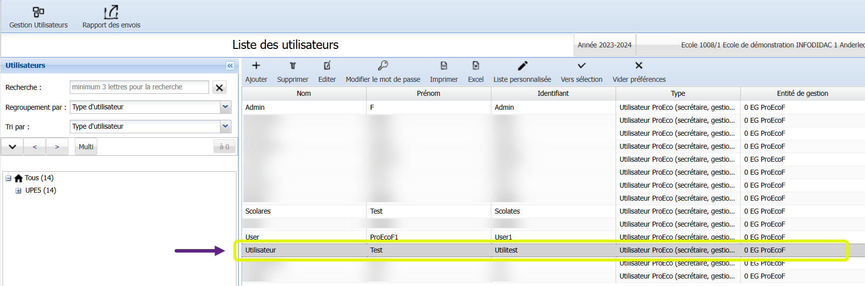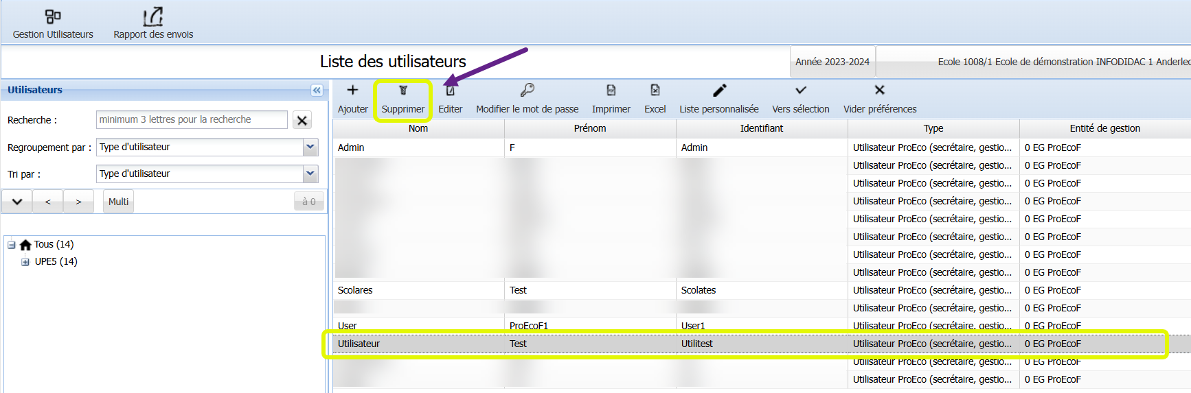 Dans le module Gestion Utilisateurs, vous pouvez supprimer des utilisateurs de votre ProEco5, si vous êtes un utilisateur Directeur d'école. Cette suppression, qui ne concerne que le type Utilisateur ProEco, s’effectue à partir de la liste des utilisateurs. Vous sélectionnez l’utilisateur et vous le supprimez. Après suppression, l’utilisateur n’a plus accès à votre ProEco5.