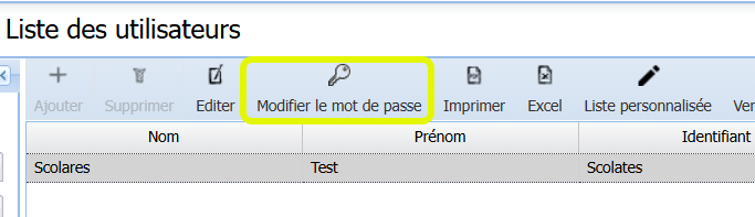 Lorsque la ligne de votre utilisateur est sélectionnée dans la liste, vous appuyez sur le bouton <Modifier le mot de passe> dans le menu d’actions :