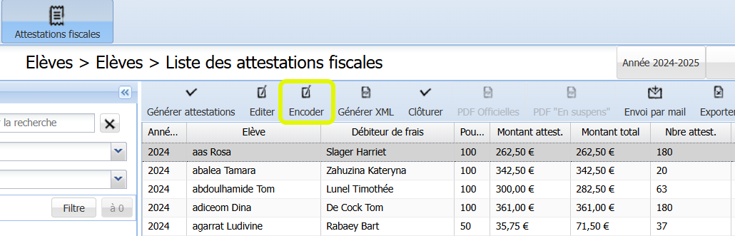 La mise en suspens et l’encodage du nombre de jours peuvent s’effectuer en masse. Pour ce faire, vous sélectionnez d’abord les attestations concernées (par exemple, via une multi-sélection). Puis, vous appuyez sur le bouton "Encoder" :