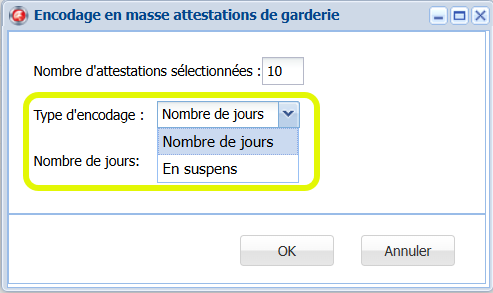 Vous choisissez le type d’encodage que vous souhaitez faire : le nombre de jours ou la mise en suspens. Pour le nombre de jours, vous spécifiez le nombre à encoder dans les attestations sélectionnées.