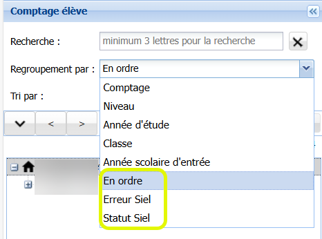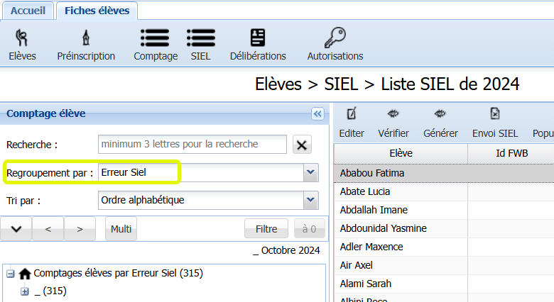 C’est dans le module SIEL de ProEco5 qu’il est le plus facile de consulter le statut des inscriptions des élèves dans SIEL. Dans la fenêtre centrale, vous voyez les lignes de comptage de tous les élèves pour le comptage en cours. Les lignes de comptages sont regroupées par "Erreurs SIEL", ce qui vous permet d’identifier facilement les inscriptions qui posent un problème dans l’arbre :