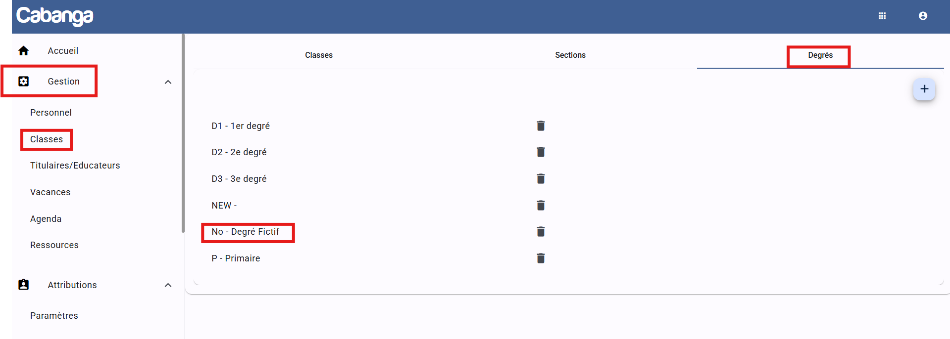 - Créez un degré "NO", une section "No" et une classe fictive "Élèves sortants".