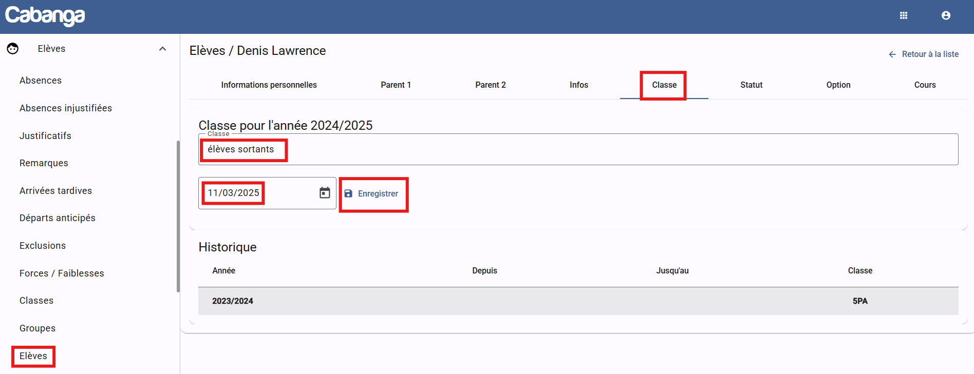 - Modifiez la classe de l’élève en sélectionnant "Élèves sortants".