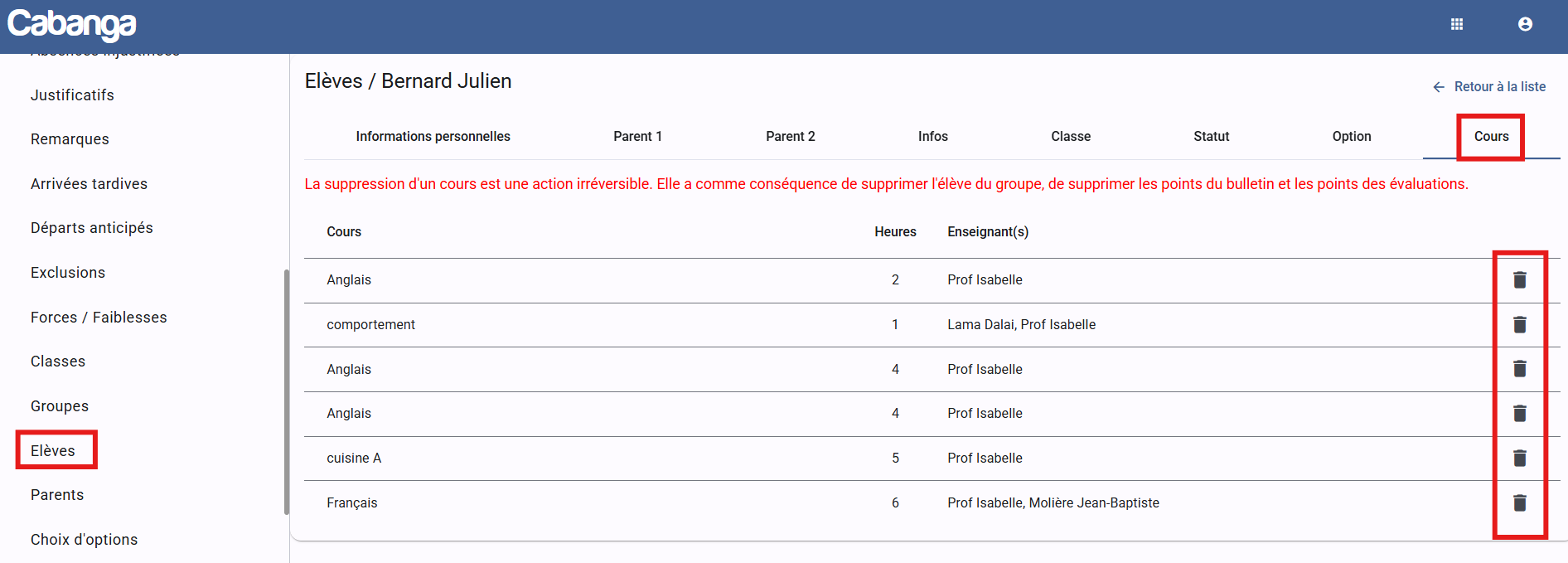 - Une fois le transfert effectué, l’administrateur peut retirer l’élève des cours en cliquant sur l’icône de la corbeille dans la section correspondante.
