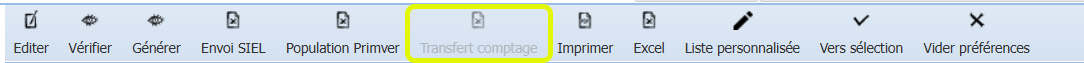 Le transfert du comptage à l’Administration s’effectue à partir du module SIEL de ProEco5. Il faut simplement appuyer sur le bouton <Transfert comptage> (quand il est activé) dans le menu d’actions :