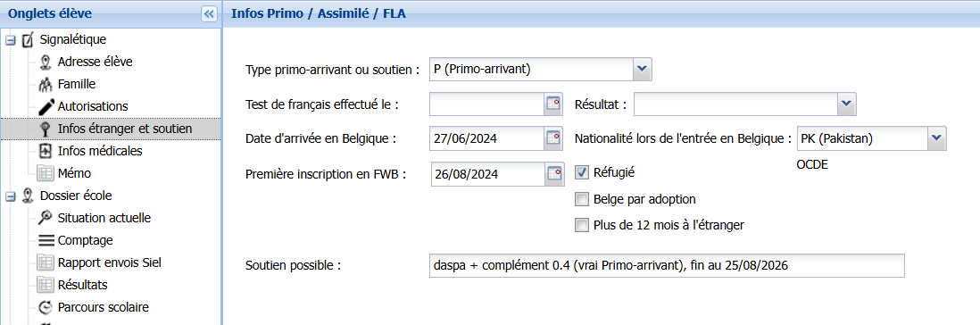 - Soutien possible : Ce champ résume les informations étranger et de soutien possible de l'élève avec la date de fin de ce soutien (24 mois après la première inscription en FWB).