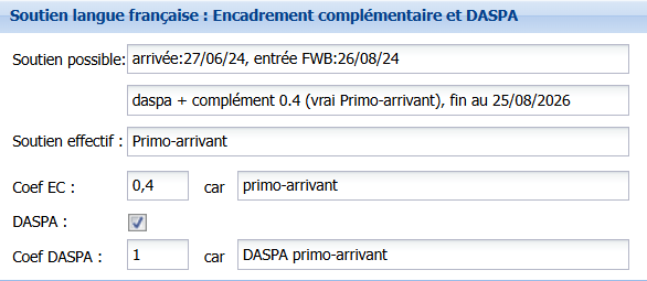 Si vous avez complété les infos étranger et le soutien d'un élève primo-arrivant, ses informations de soutien à la langue d'enseignement s'affichent sous l’onglet <Comptage>, dans la rubrique "Soutien langue française : Encadrement complémentaire et DASPA" :