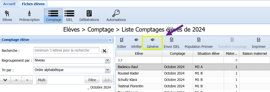 Des coefficients et périodes spécifiques sont applicables aux élèves primo-arrivants. Il est possible de les prévisualiser dans le module Comptage (avant les envois SIEL). Vous générez les comptages en appuyant sur le bouton <Générer> dans le menu d’actions :