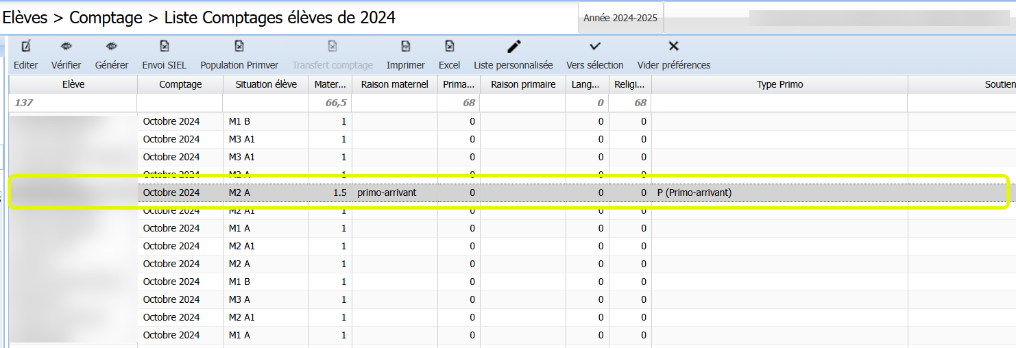- Soutien effectif : Il est mentionné "primo-arrivant" si l'élève est toujours dans la période de valorisation de son statut. Après 24 mois, cette case devient blanche.