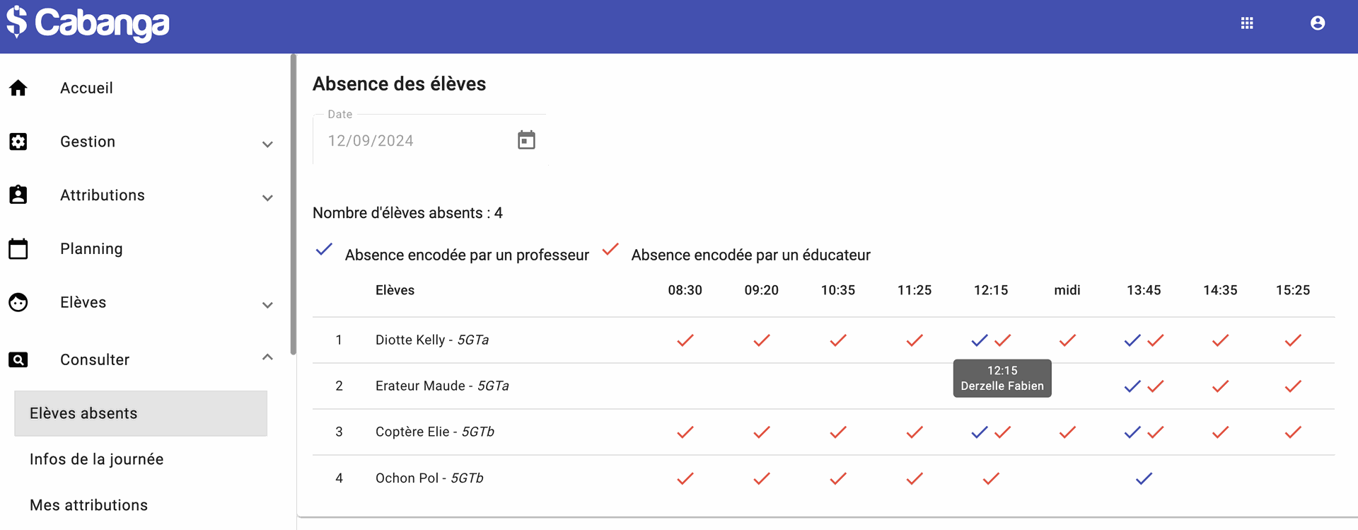 Le survol d'un 'V' vous indique qui a encodé l'absence.