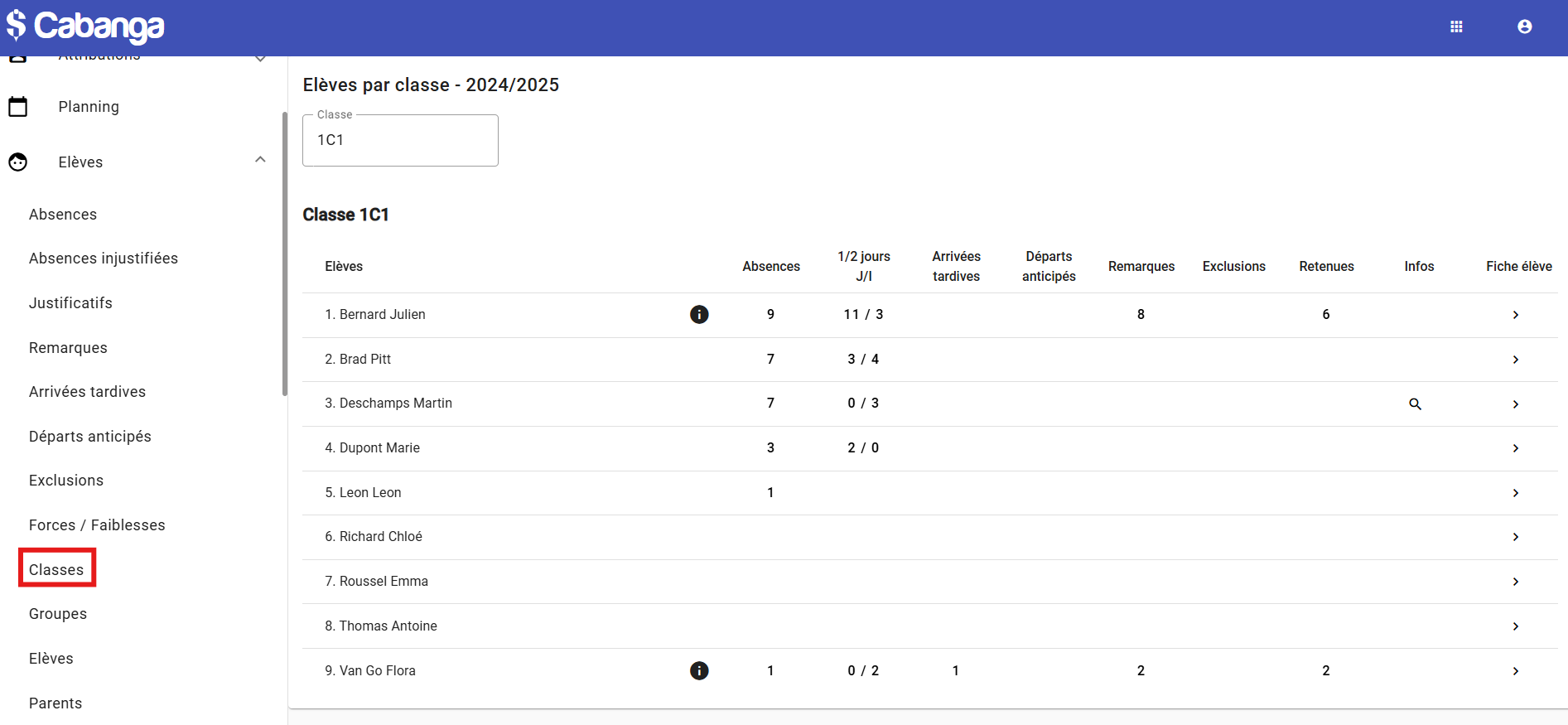 Via la page "Elèves / Classes", vous pouvez consulter de nombreuses informations liées à tous les élèves d'une classe, comme par exemple le nombre de jour d'absences pour chacun des élèves.