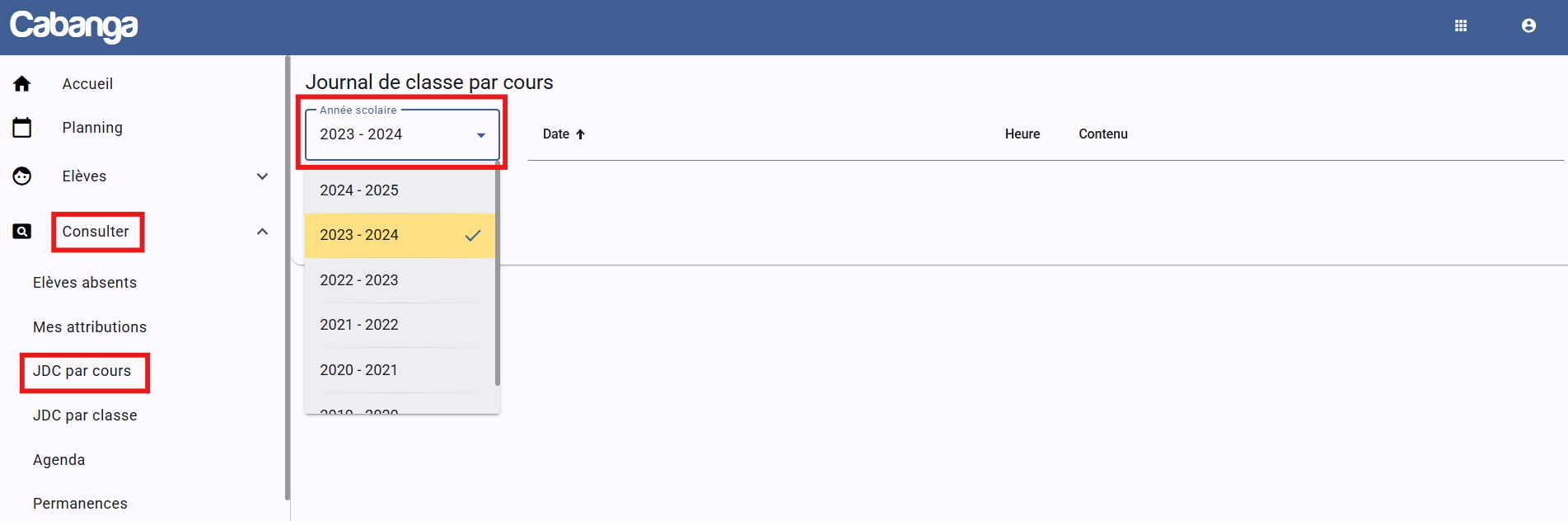 NB: Dans le menu "consulter/JDC vous pouvez consulter votre JDC pour les années précédentes en choisissant l 'année dans le menu "Année scolaire".