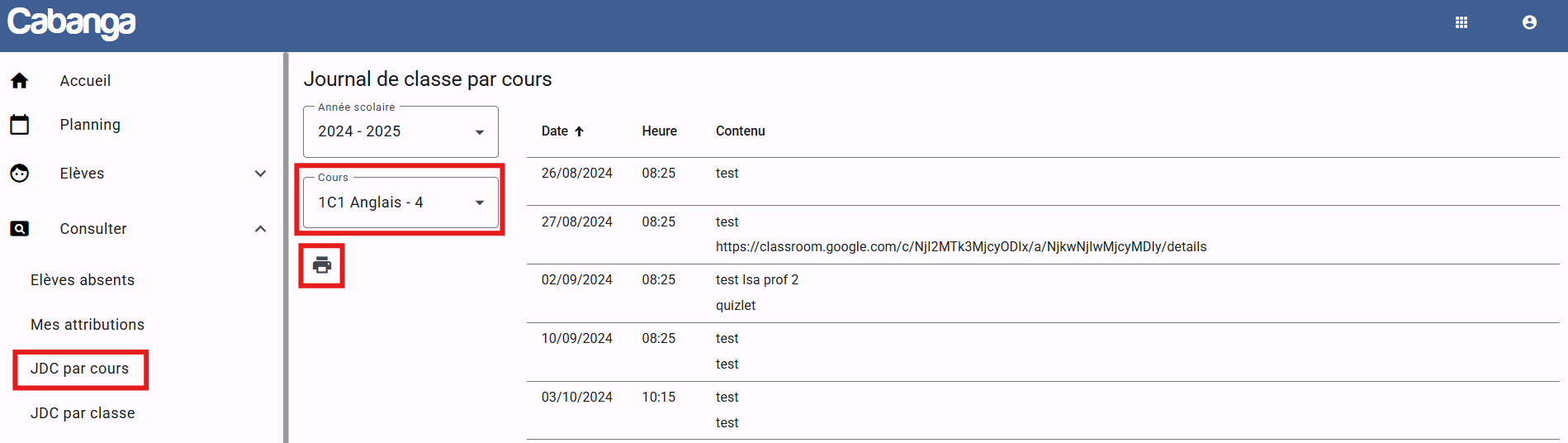 - Consultation / JDC par cours -> Vous permet de consulter tout ce que vous avez fait dans chacun de vos cours depuis le début de l'année (ou les années précédentes) et d'en générer un PDF.