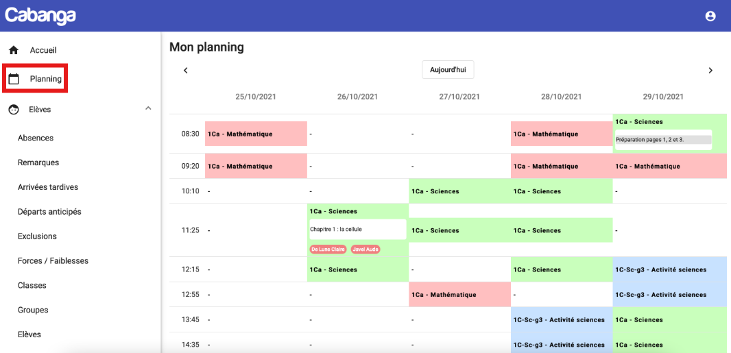 Vous pouvez cliquer sur une plage horaire de votre planning pour encoder votre journal de classe. Vous pouvez cliquer sur les plages en couleur, et sur les plages vides.