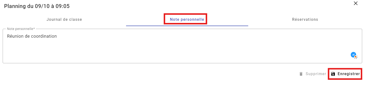 Le deuxième onglet du planning permet d'encoder des notes personnelles, qui ne sont pas liées à un cours (encoder une réunion, un rendez-vous, etc).