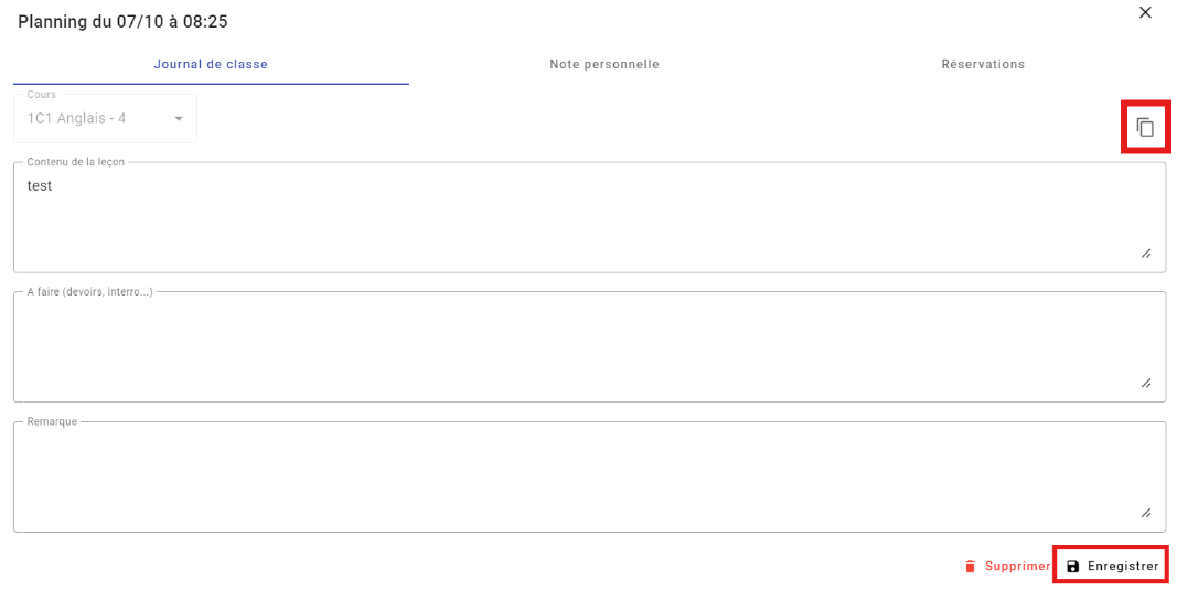 - Contenu de la leçon : encodez ce qui a été fait au cours ce jour-là.