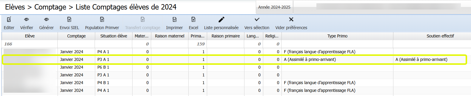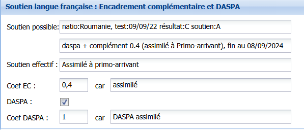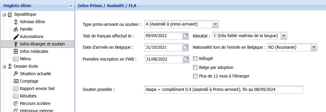 - Soutien effectif : Il est mentionné "assimilé à primo-arrivant" si l'élève est toujours dans la période de valorisation de son statut. Après 24 mois, cette case devient blanche.