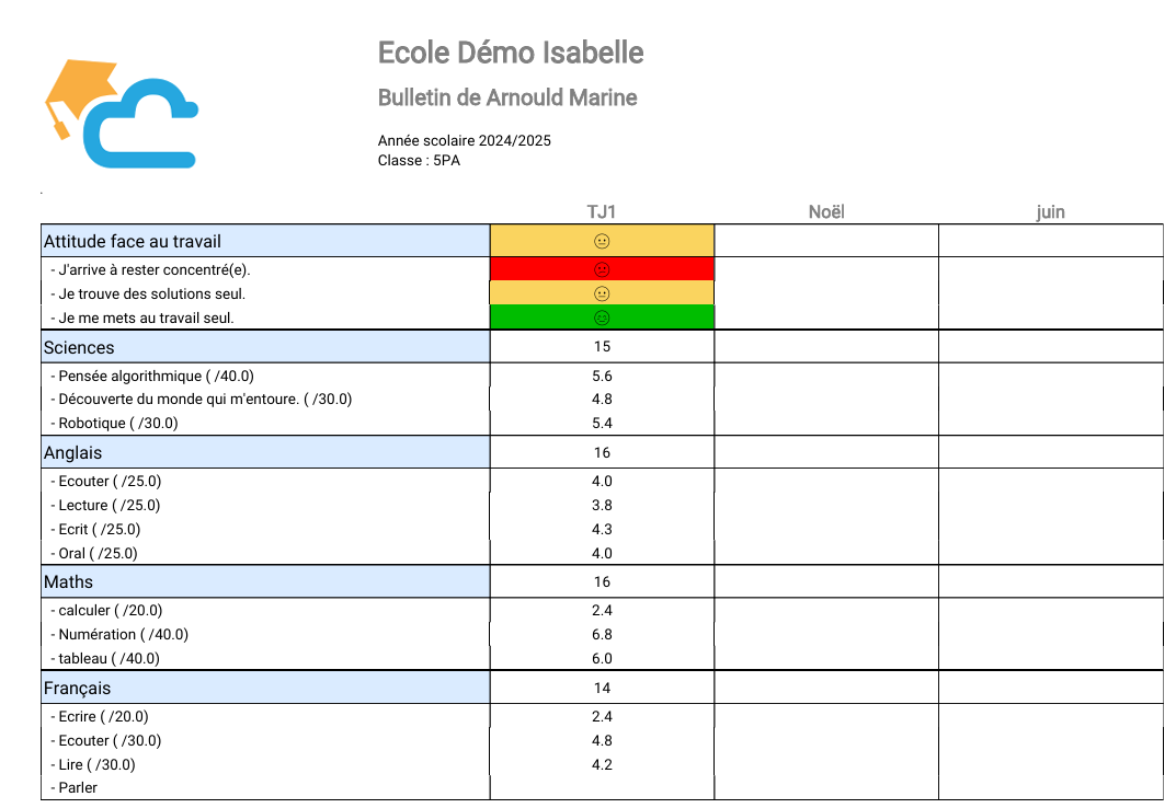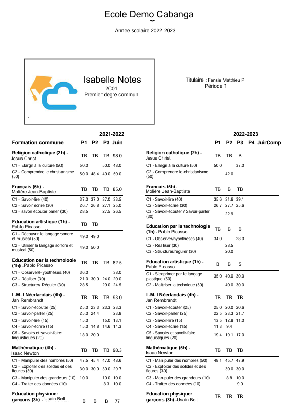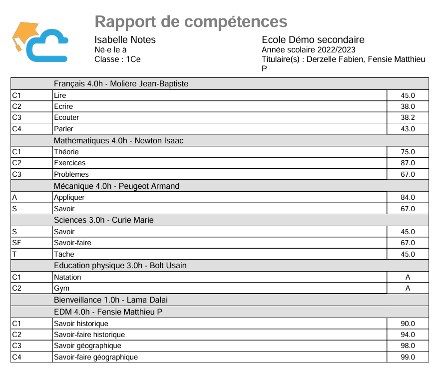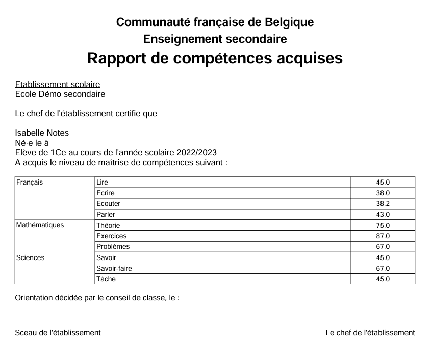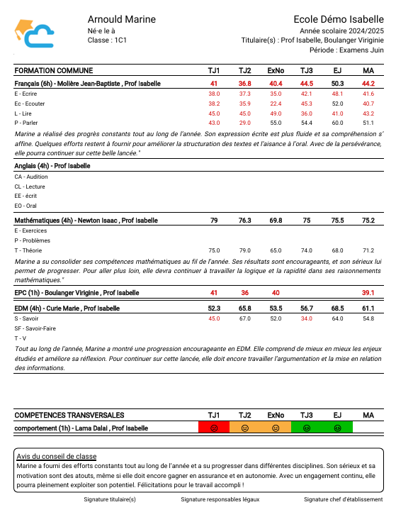 Bulletin D1 points compétences et remarques regroupées - Exemple en PDF