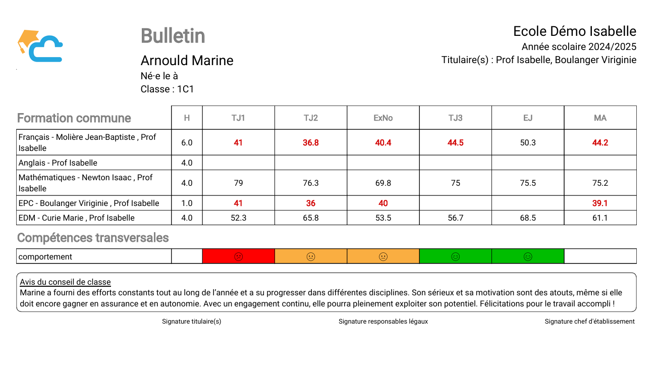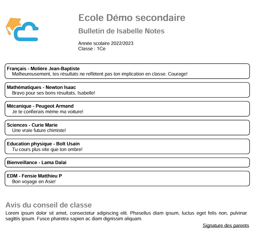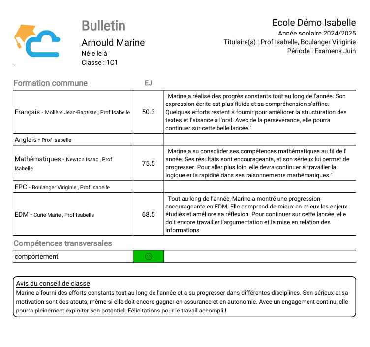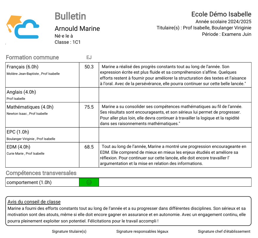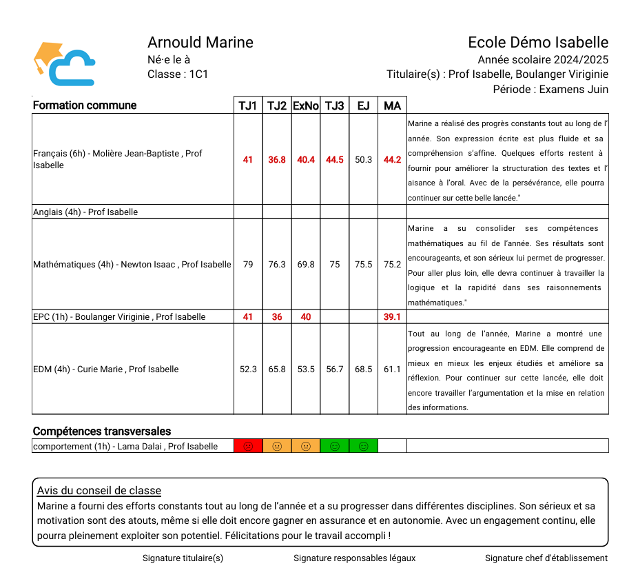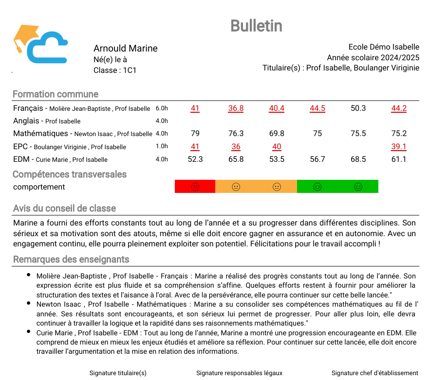 Bulletin portrait avec commentaires sous les cours - Exemple en PDF