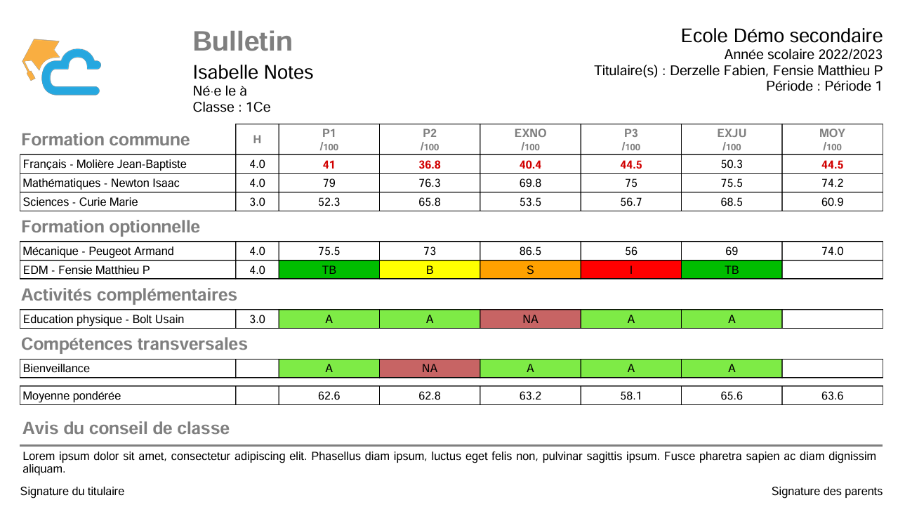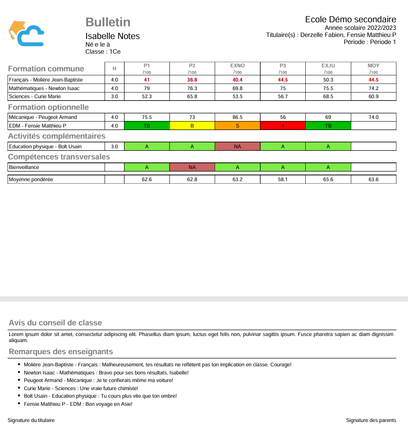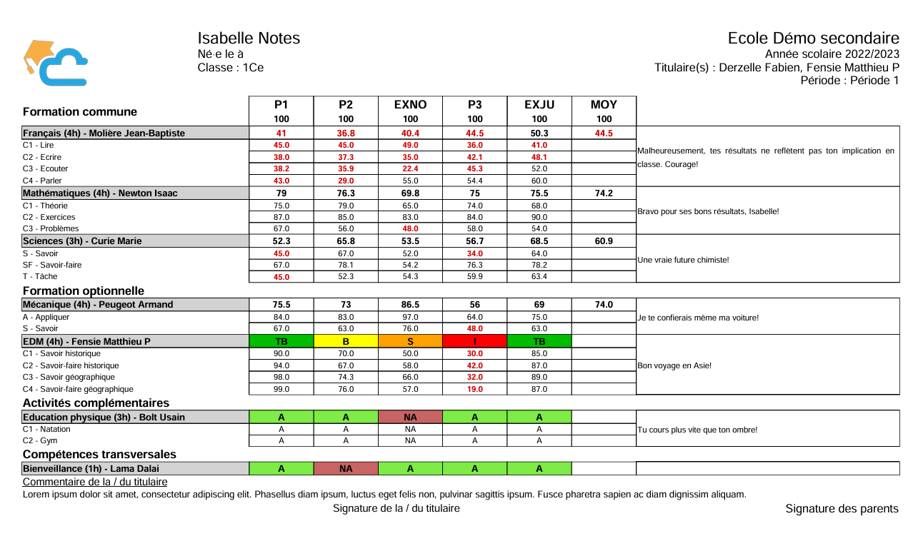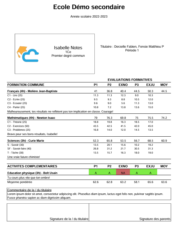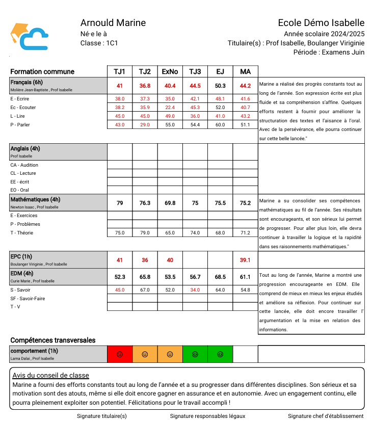 Bulletin portrait avec commentaires sous les cours - Exemple en PDF