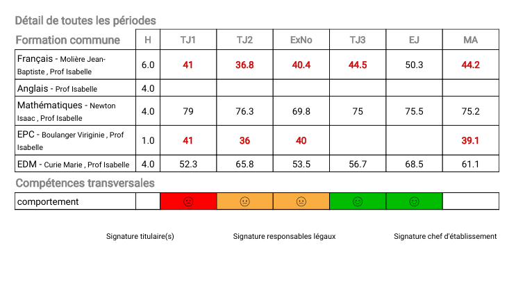 Bulletin en 3 parties. 1, les points des cours, 2 les avis de conseil de classe et les remarques par professeur, 3, les points par compétences pour toutes les périodes
