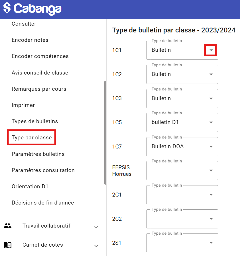 Dans "Bulletin - Type par classe", vous devez attribuer un type de bulletin par classe en le sélectionnant à l'aide de la flèche.