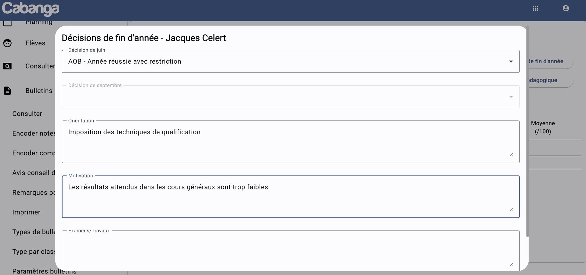 Encoder la décision de juin ou de septembre, l'orientation, la motivation et/ou les examens/travaux.