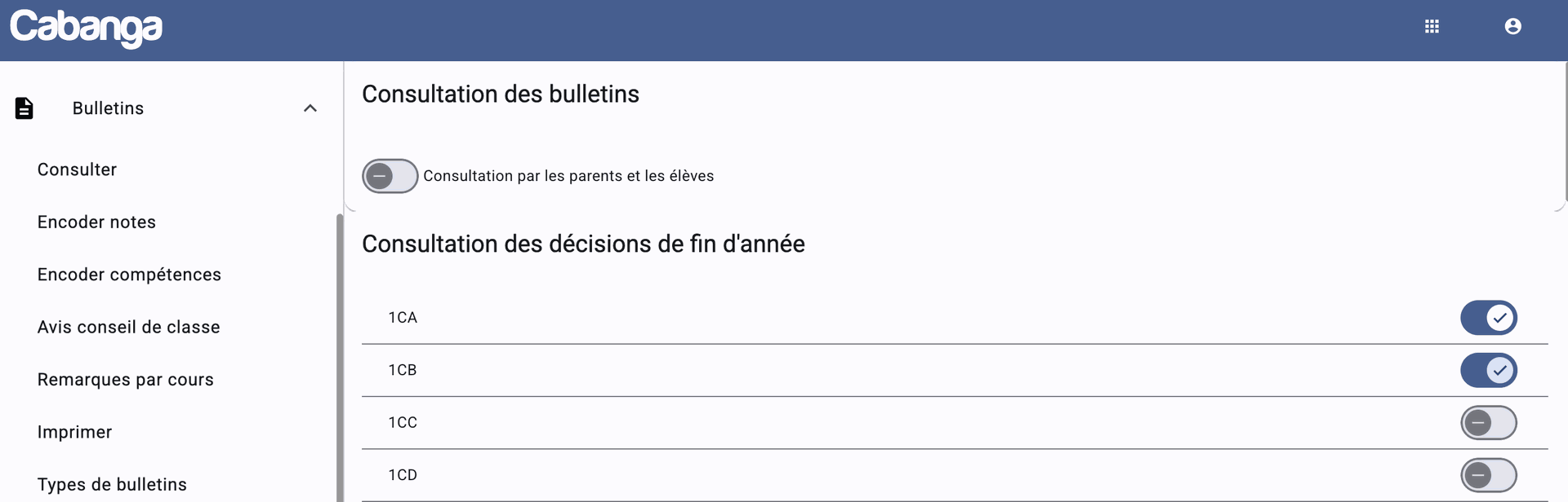Pour ce faire, vous devez autoriser la consultation par classe via la page Bulletins / Paramètres de consultation.